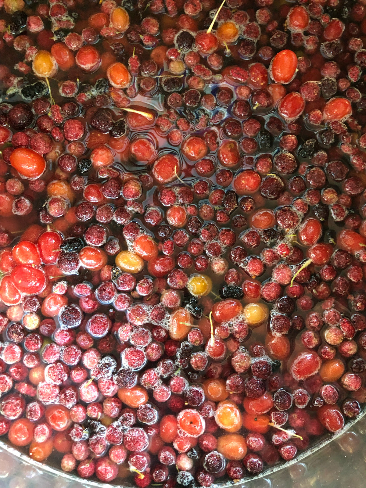 庭の木々から集めた赤い実を加えてシロップに。仕上げはたっぷりのタイム、マジョラムを加えて甘酸っぱさの中に、深い香りの層を作りました。