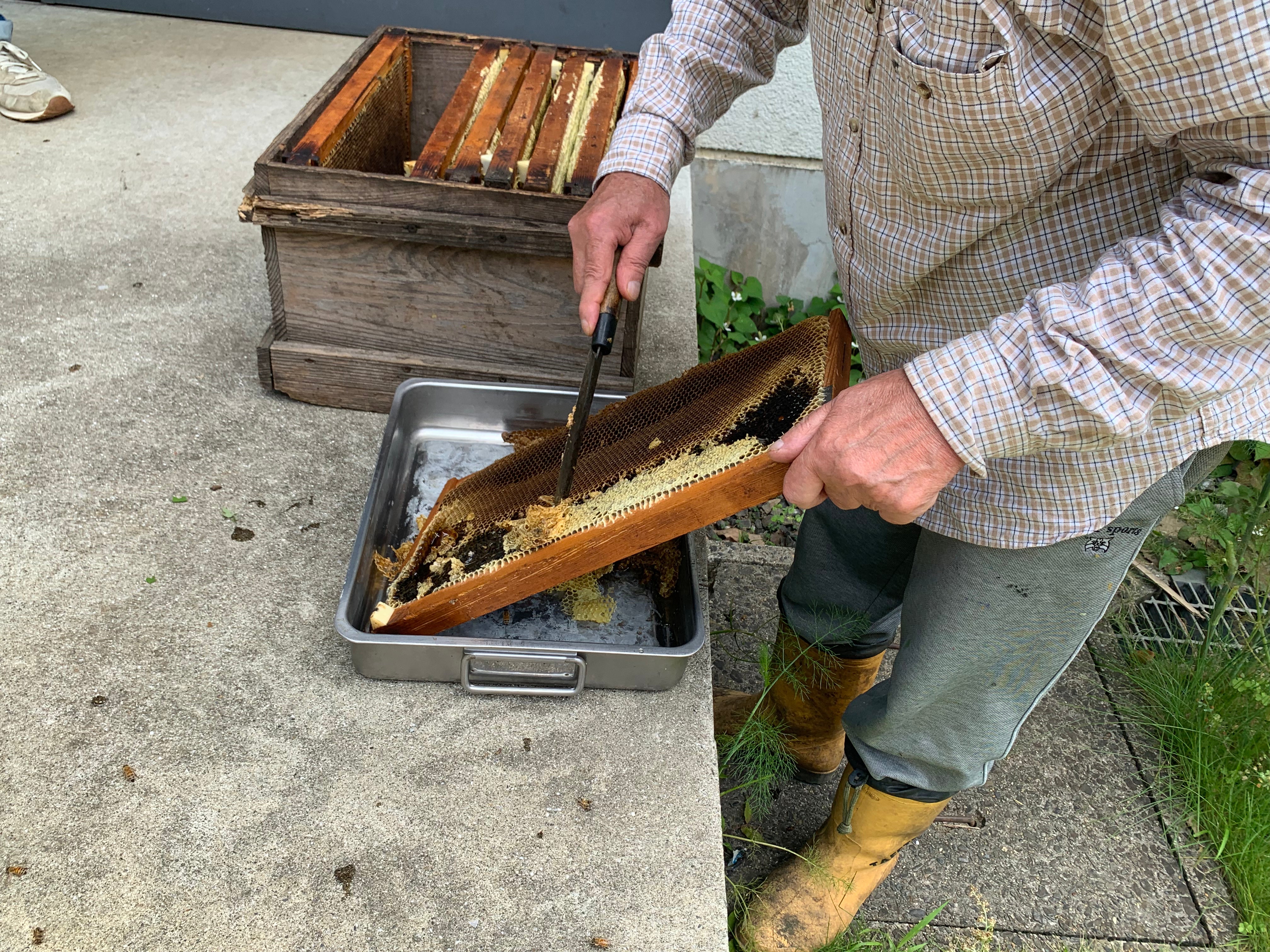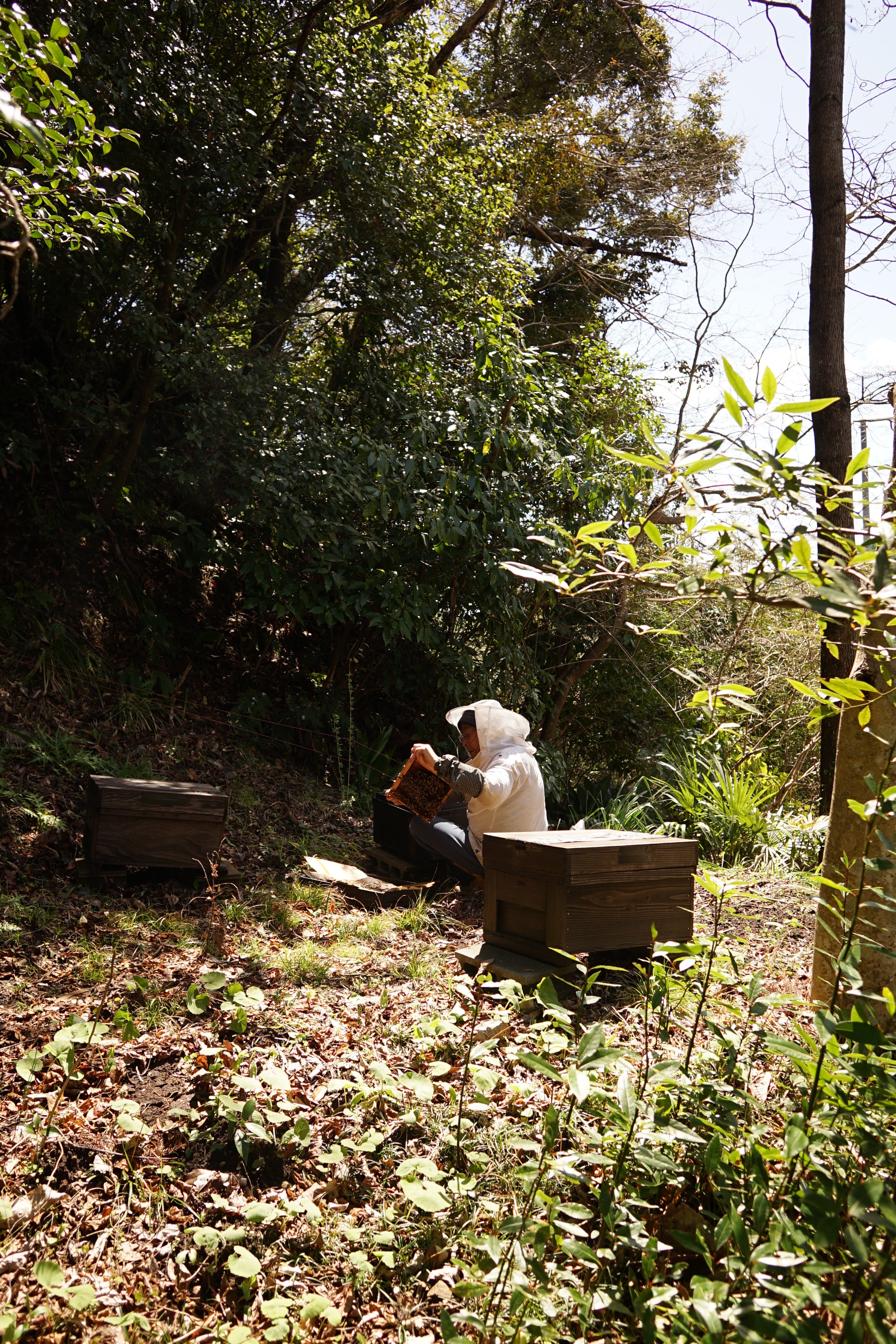 In spring and early summer, when all the plants on the property are in full bloom, the bees are actively flying around, and can be heard and seen in various places. We, along with Mr. Asao, a local beekeeper, help with hive inspections, honey collection, and other tasks, dressed in protective clothing that we are not accustomed to.