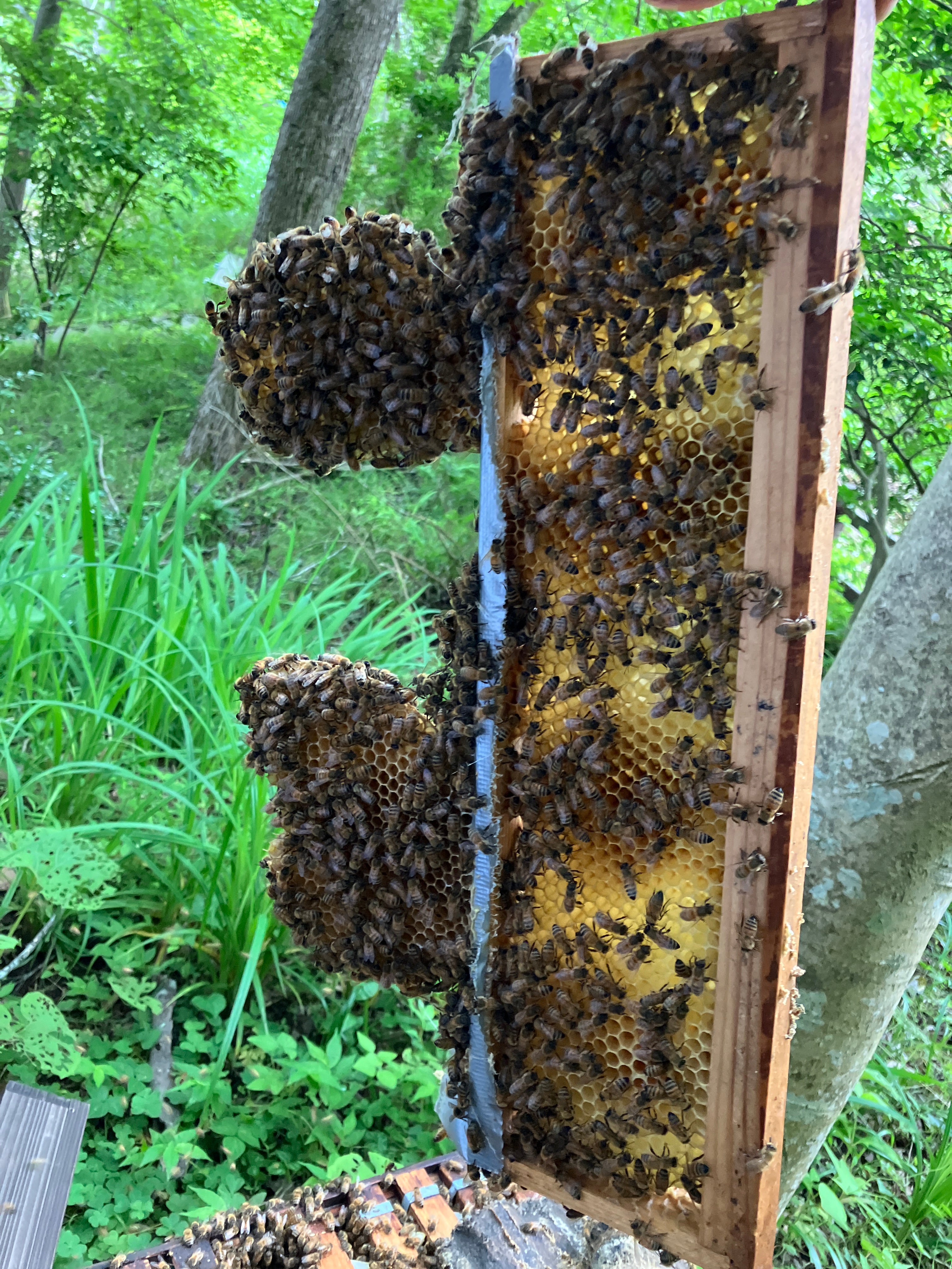 敷地内の植物たちが一斉に花開く春から初夏にかけては、ミツバチたちも活発に飛び回り、様々なところで羽音が聞け、姿をみることができます。私たちも地元の養蜂家、朝生さんと共に、慣れない防護服に身を包み、巣箱の検査や、採蜜などの手伝いをしています。