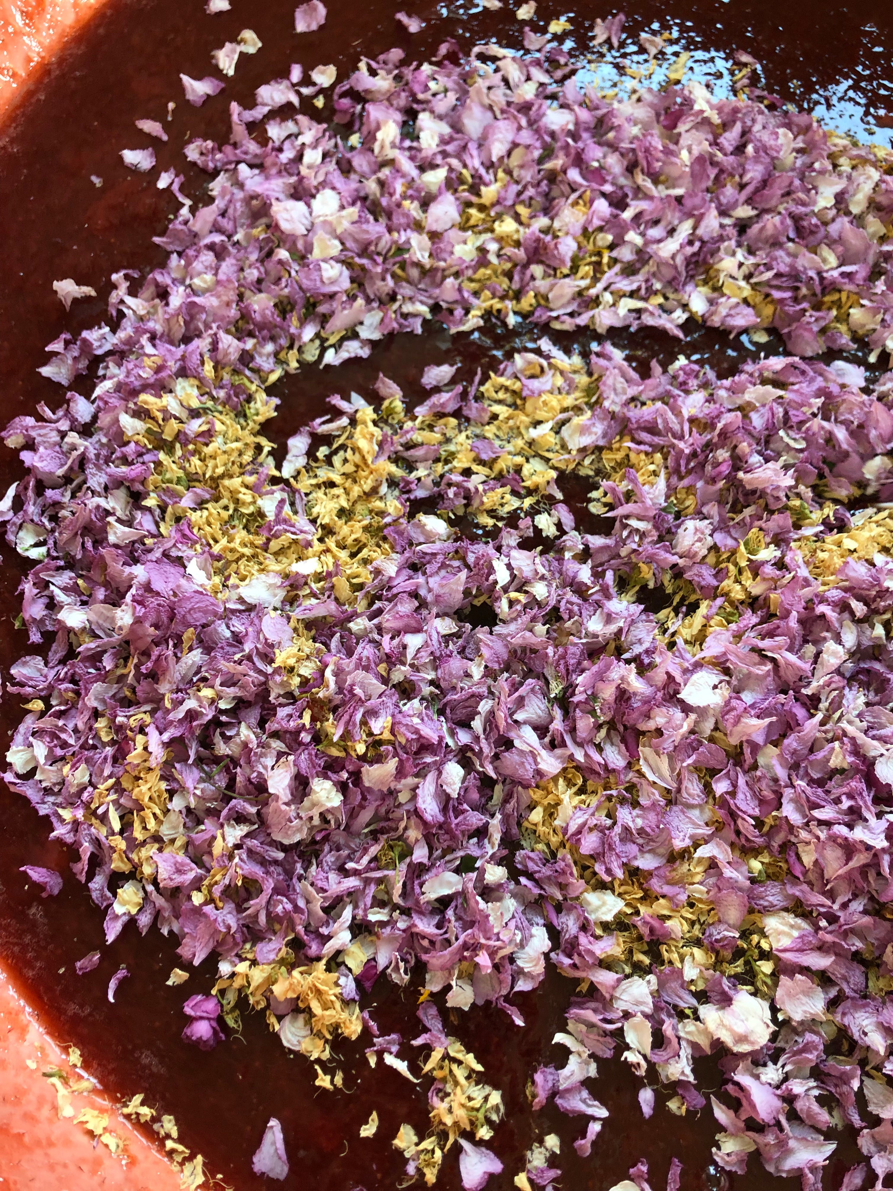 真紅の美しく煮え上がったジャムに加えたのは、庭からこれまた摘みたての桜とすももの花びら。クロアチアの、ハーブ豊かな地で生まれたジンを最後に香りつけに。