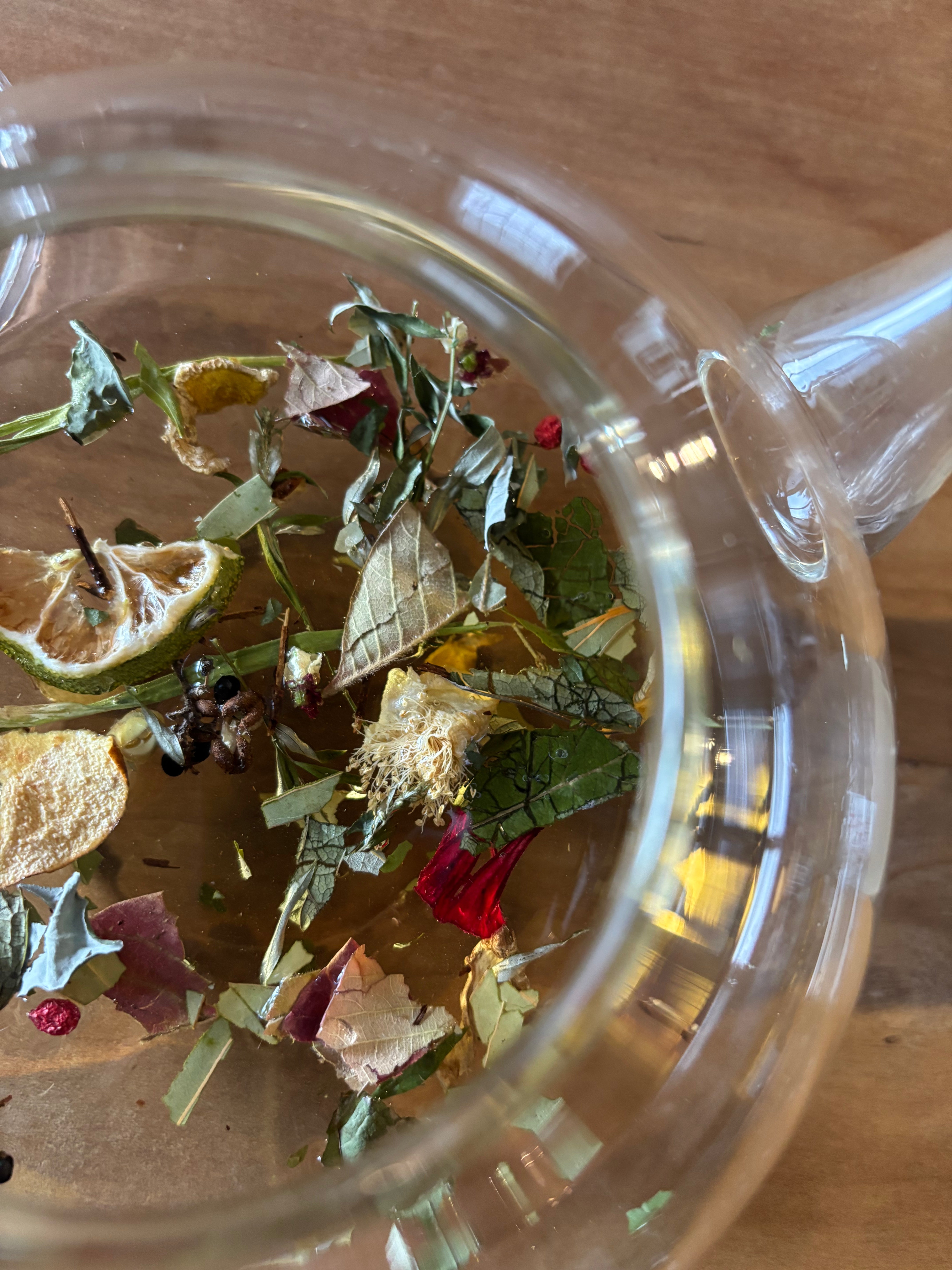 従来は薬草は粉状になっており、大晦日にお酒やみりんに漬け込んでお正月に飲むのが習わしとされていますが、mitosayaの屠蘇は、まずその植物をちぎったり、触れて香りを楽しむところから。お好きな量をポットや深い容器などに入れ、お酒などを注いで数時間~一晩、漬け込みます。お酒以外にもミルクで煮出してチャイにしたり、お茶と一緒に抽出して薬草ブレンドなど、使い方自由にお楽しみいただけたらと思います。