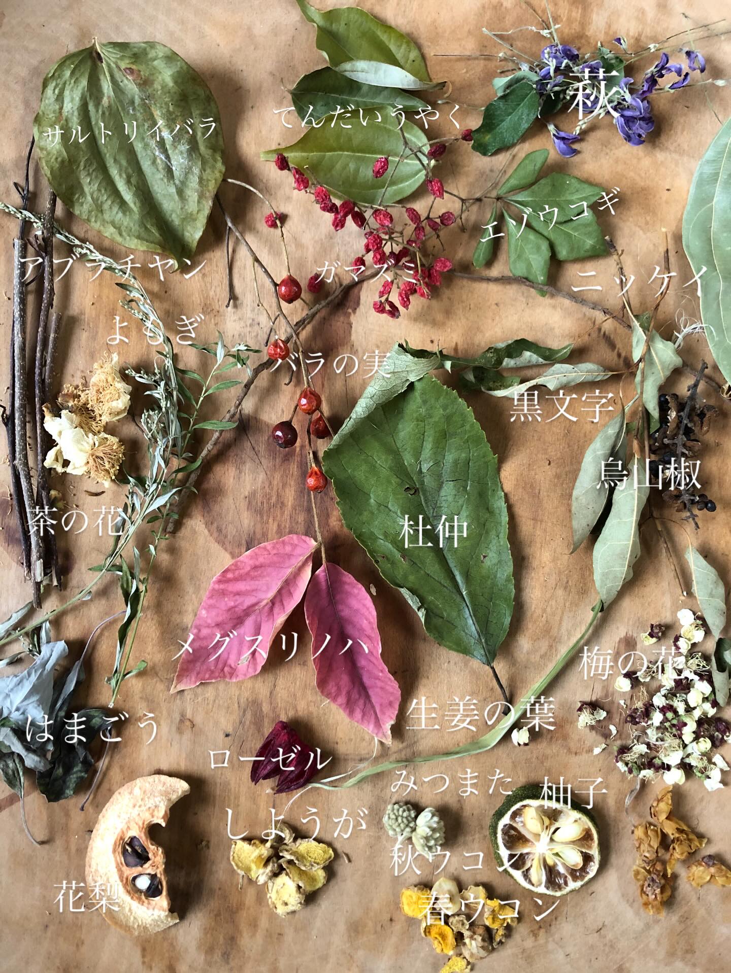 原材料:梅、蝋梅、三叉、蓬、杜仲、ローゼル、黒文字、アブラチャン、天台烏薬、萩、茶の花、ハマゴウ、サルトリイバラ、生姜、生姜葉、エゾウコギ葉、薔薇の実、花梨、柚子、春ウコン、秋ウコン、肉桂葉、肉桂根、メグスリの葉、烏山椒