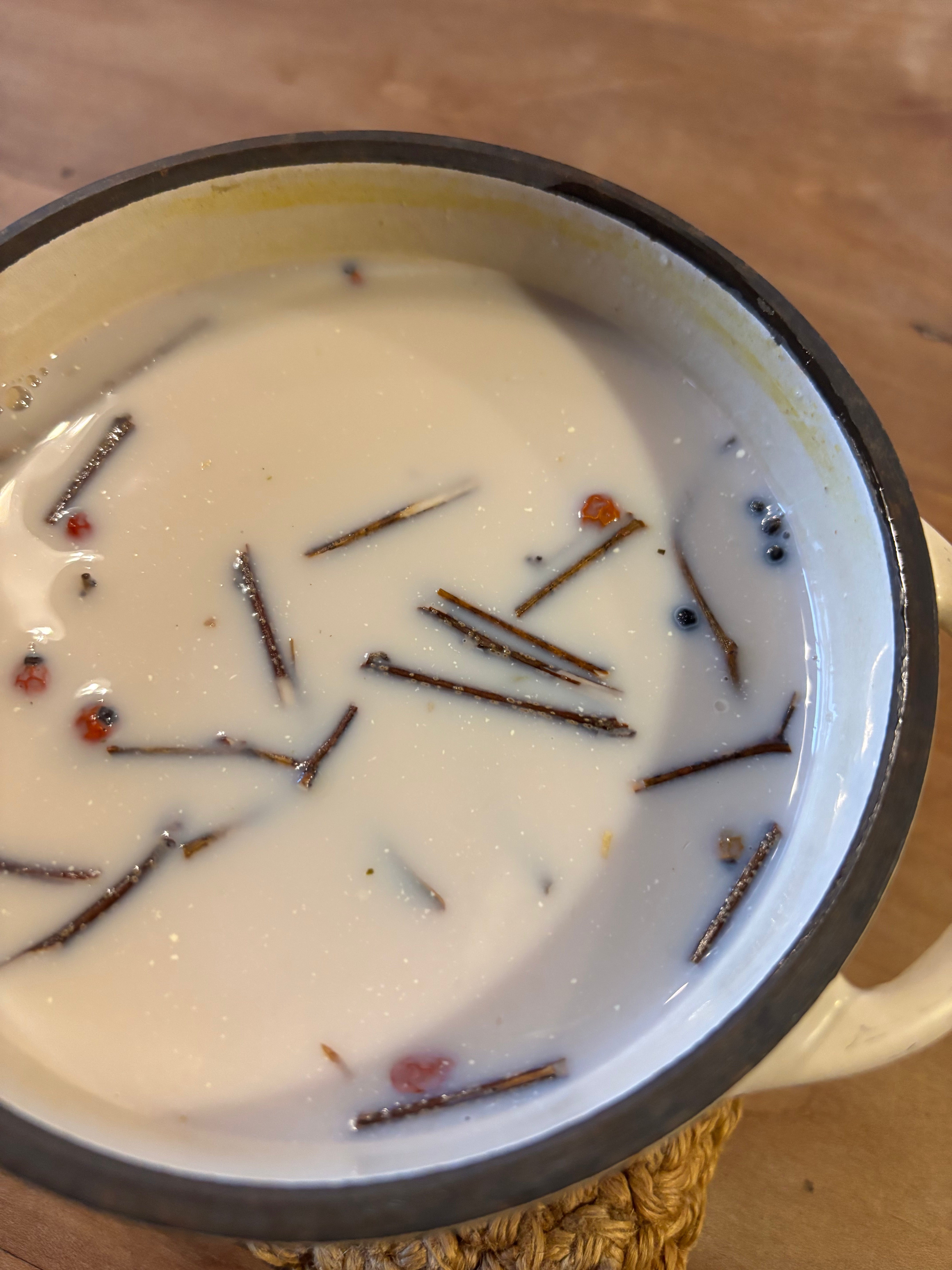 鍋に適当にちぎった屠蘇を入れ、お湯で数分抽出。ミルクを加えてひと煮立ちさせ、砂糖やはちみつで味を整えます。