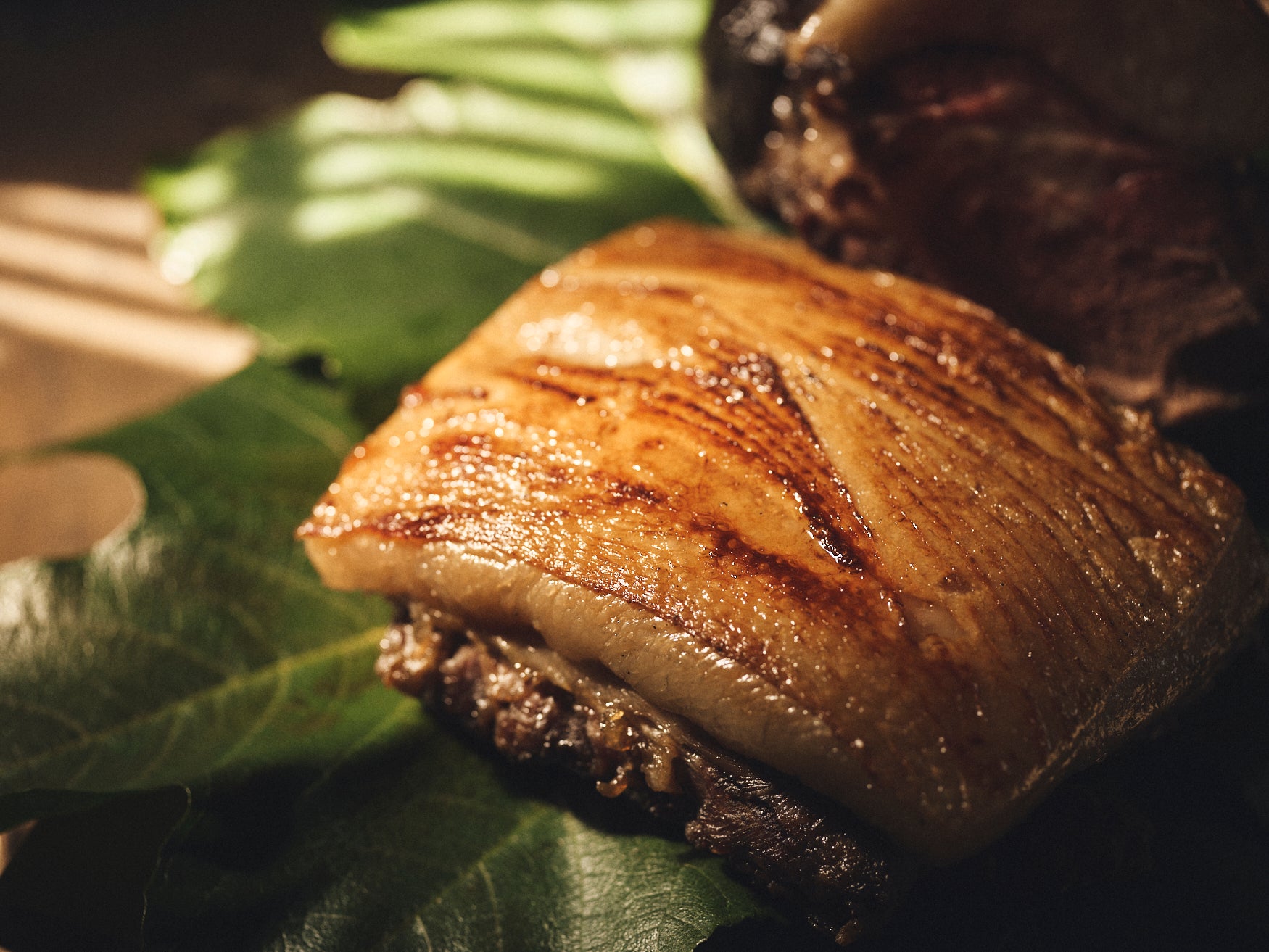 Grilled dish:Grilled wild boar wrapped in fig leaves in a salted rice oven